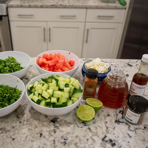 Add the watermelon, cucumbers and herbs into a large mixing bowl and toss until evenly mixed. Add feta cheese and toss again.